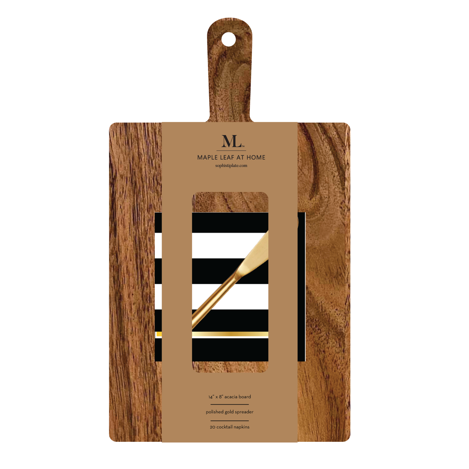 14x8" Acacia Board w/ Handle Gold Spreader, Cordoba Napkin