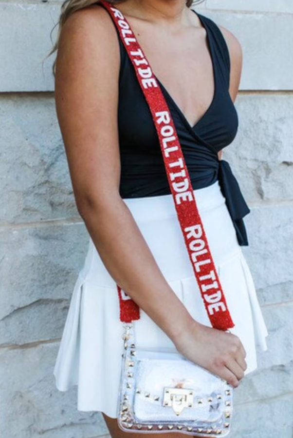 Introducing our handmade beaded purse strap, perfect for showing off your love for the University of Alabama and their iconic rallying cry, "ROLL TIDE" Perfect with a clear bag for game day.