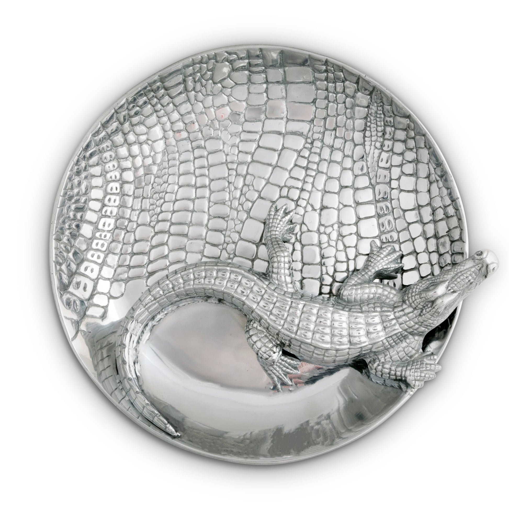 Meet the Arthur Court Chip and Dip Tray, your ideal wedding gift choice. Beautifully crafted in detailed aluminum with a unique alligator theme, it brings a taste of the tropics to your table. This Arthur Court Alligator Chip and Dip Aluminum Tray is perfect for entertaining guests at a casual gathering or a lavish party. Its size comfortably accommodates a generous amount of chips and dip. You'll love how this elegant alligator chip and dip set adds a touch of luxury to your home. It also makes for an excellent housewarming present. Not just pretty, it's built to last. Durable, easy-to-clean, and brilliantly polished, it's a piece of craftsmanship devotees of Arthur Court would love.