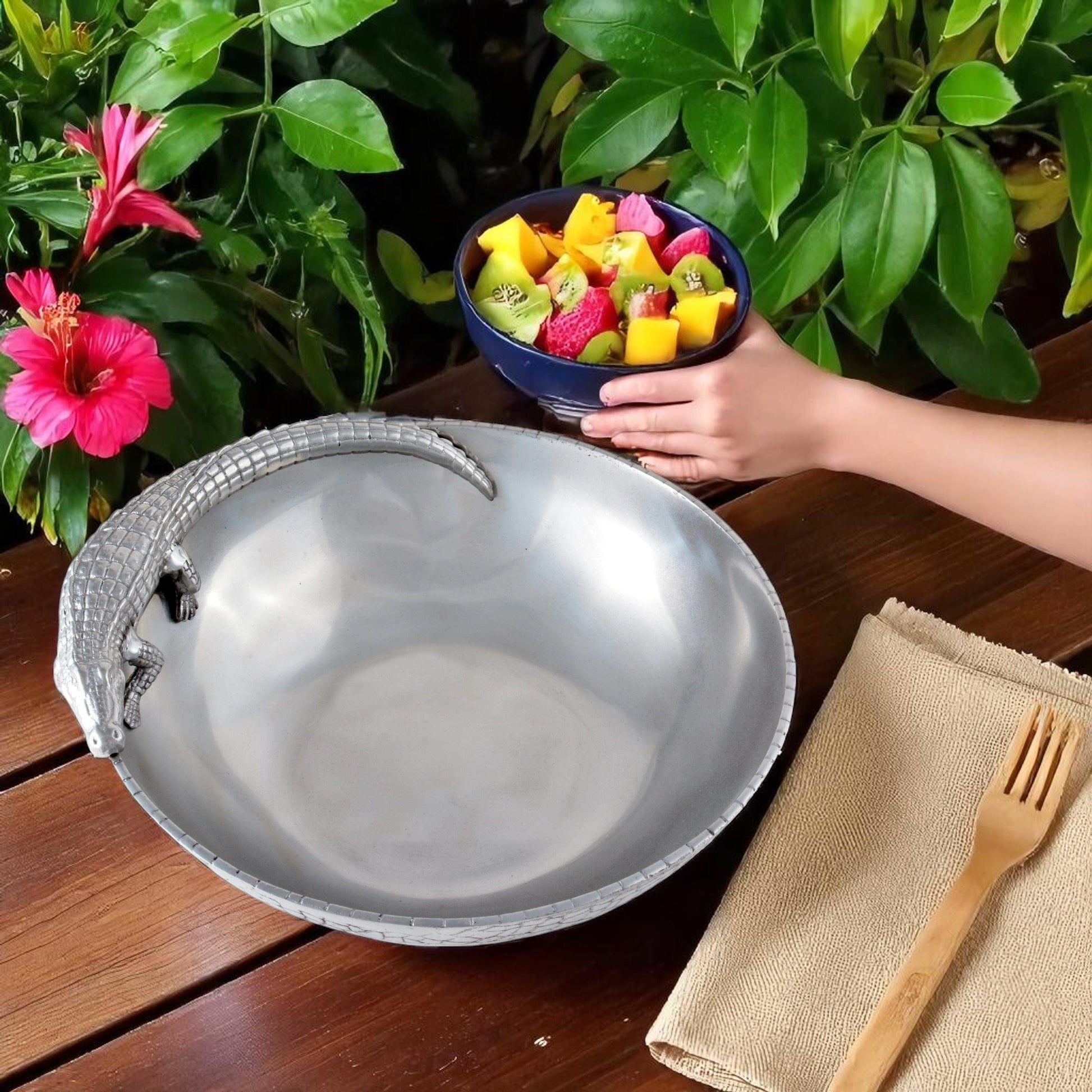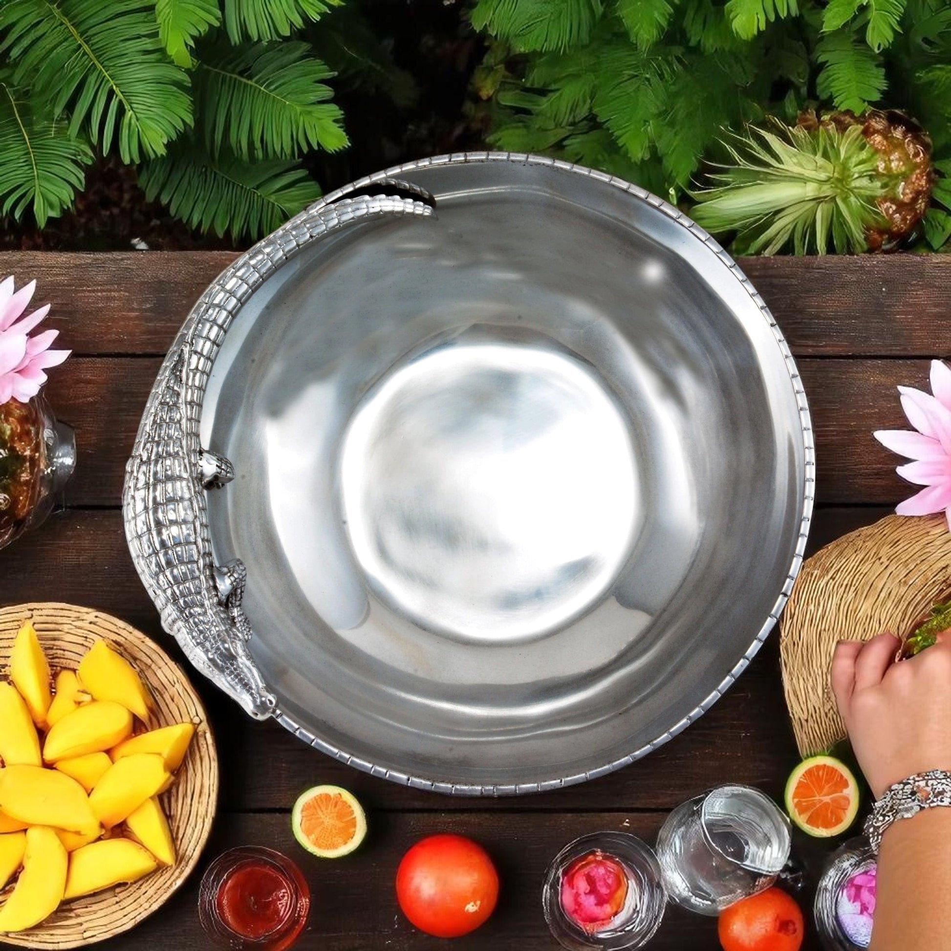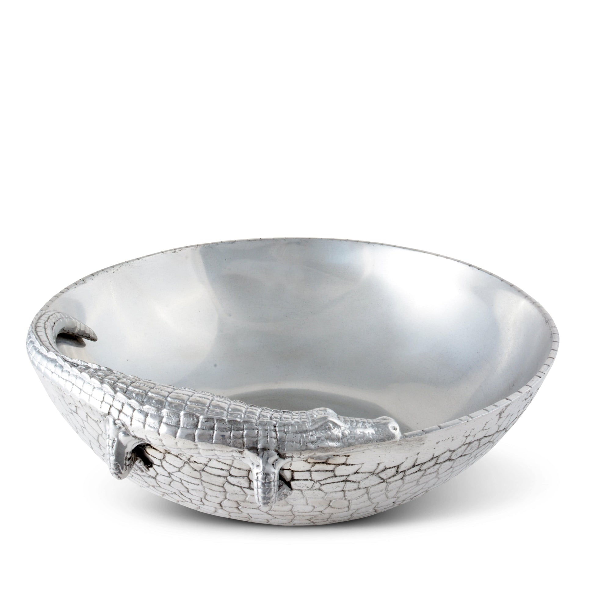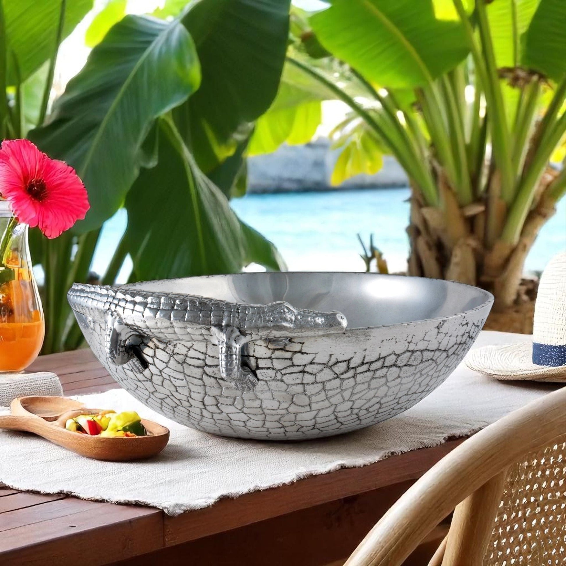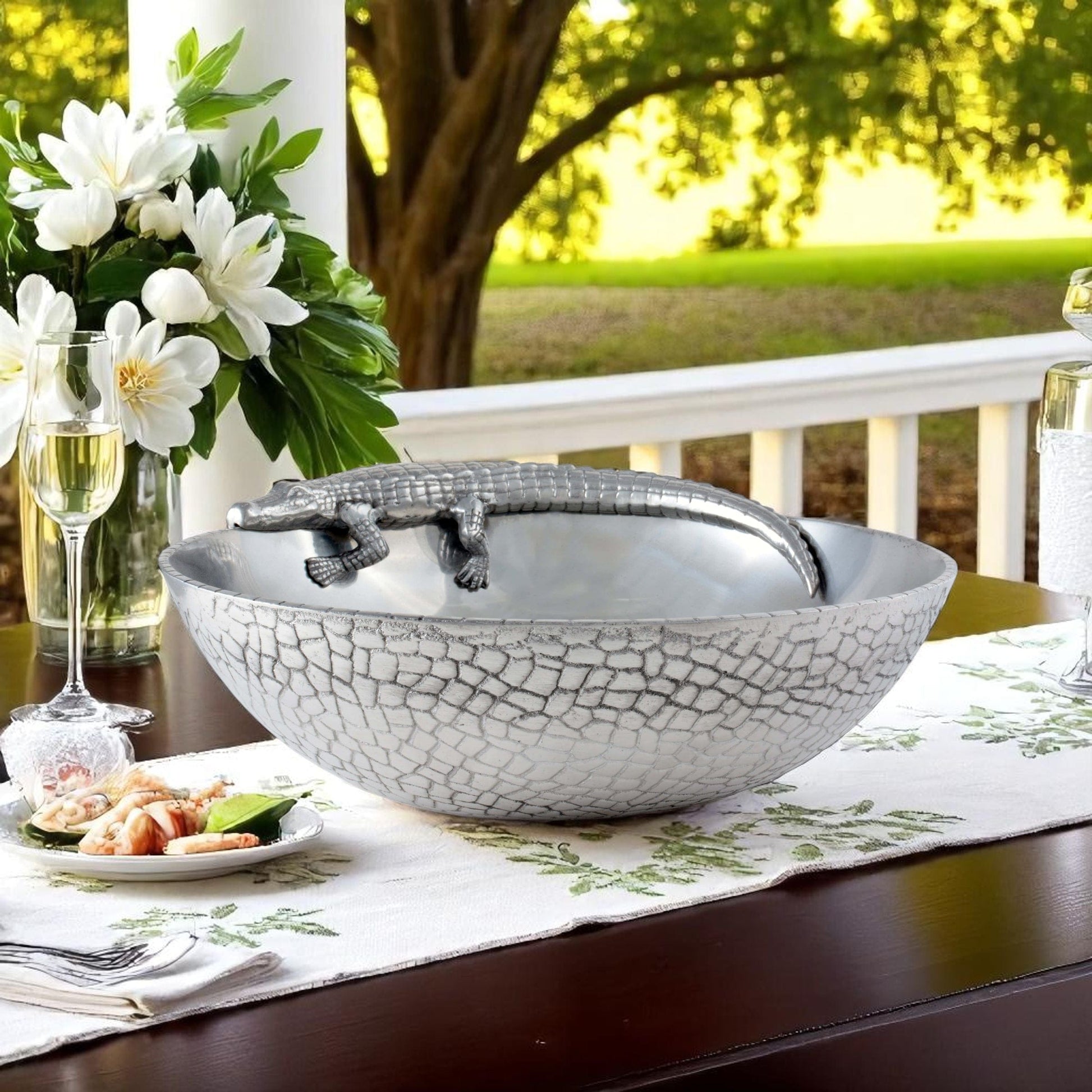 Our ‘12 Alligator Bowl from Arthur Court - Ideal Anniversary Gift’ is sure to delight any recipient. Expertly crafted with high-quality material and design, this 12 Alligator Figural Bowl showcases Arthur Court's renowned craftsmanship. Featuring a intriguing alligator rim in a textured finish, the bowl's unique and exotic appeal makes it perfect not only as a decorative piece but also a functional one. Its ample 12 inches diameter provides enough versatility for various cuisines - making it an Arthur Court 12 Bowl perfect for holiday gifting. This stunning piece is a testament to timeless elegance and sophistication, guaranteed to make your dining experience extraordinary.