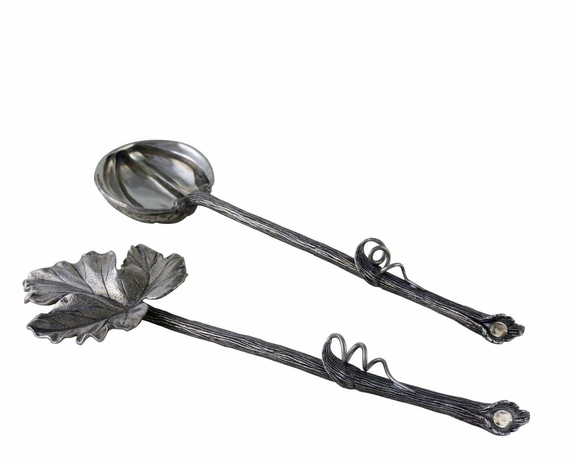 Embrace the richness of the season with our Unique Luxury Autumn-Themed Salad Server Set. Crafted from luxury-grade pewter, these generously sized 12-inch pieces from our Harvest Collection are adorned with intricate vine designs sprouting off each handle for an eye-catching autumn vibe. One server enchants with a leaf head, while the other captivates with a detailed pumpkin bowl. Perfect for fall dinner parties or as a luxury harvest gift for the salad lovers in your life.