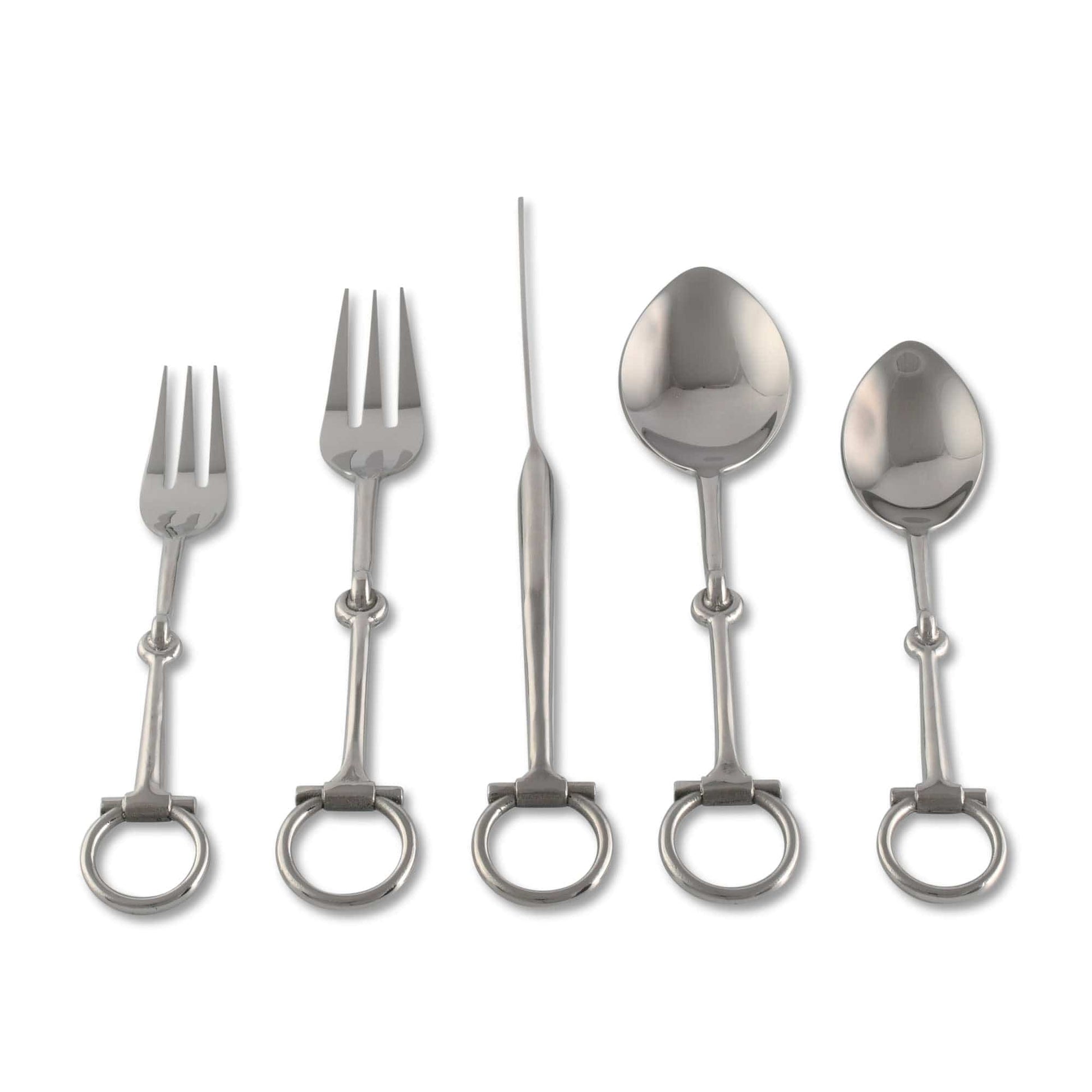 Indulge in elegance with the Matte Silver Horse Bit Flatware Set from the Equestrian Collection. Forged from stainless steel, this unique set showcases a distinctive horse-bit design and boasts a matte silver finish, underlining its sophisticated appeal. Its compact yet generous size, ideal for all dining occasions, offers an excellent balance between style and functionality. This dishwasher-safe set exemplifies craftsmanship, durability, and sprinkles a touch of equestrian passion onto your dining table.