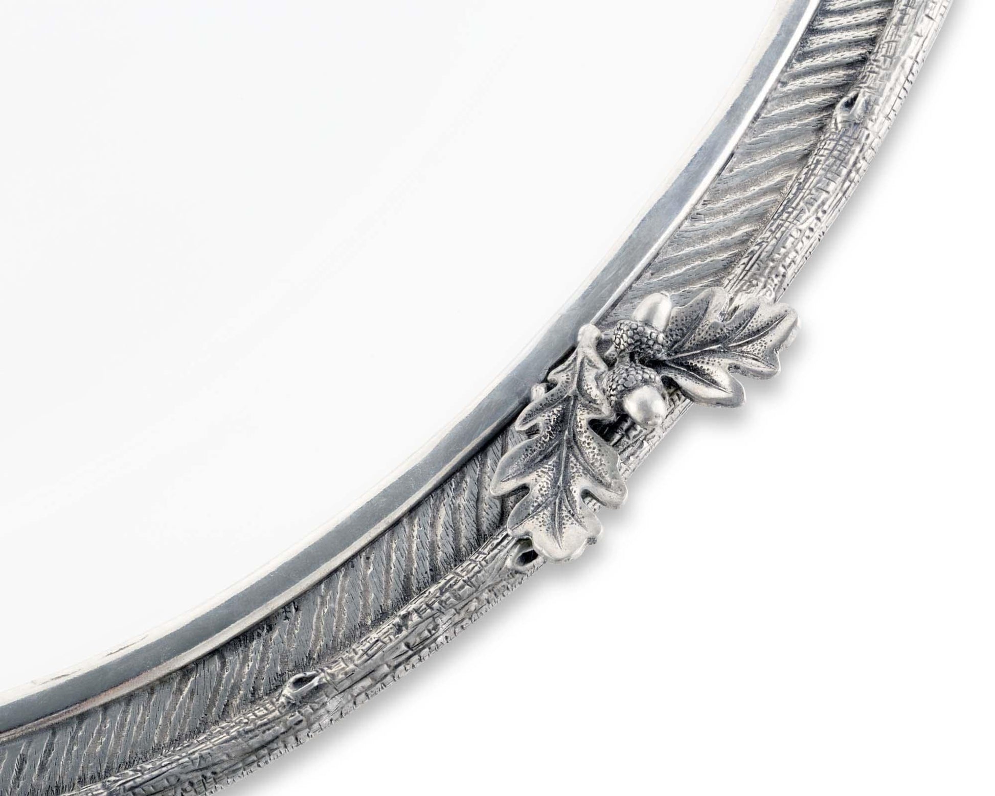 Experience just how luxurious your home decor can become with our Designer Fine Stoneware Tray. This unique, generously-sized tray showcases a hand-glazed, dual finish of pewter and stoneware. Encased in a faux bois grain pattern pewter frame, the piece sees a spray of intricately detailed acorns and oak leaves at the handles. Additional acorn and oak leaf embellishments add to its charm, making it a truly unique piece. This design treasure is versatile enough for any occasion and will soon become a family heirloom. Shop now to transform your living space.
