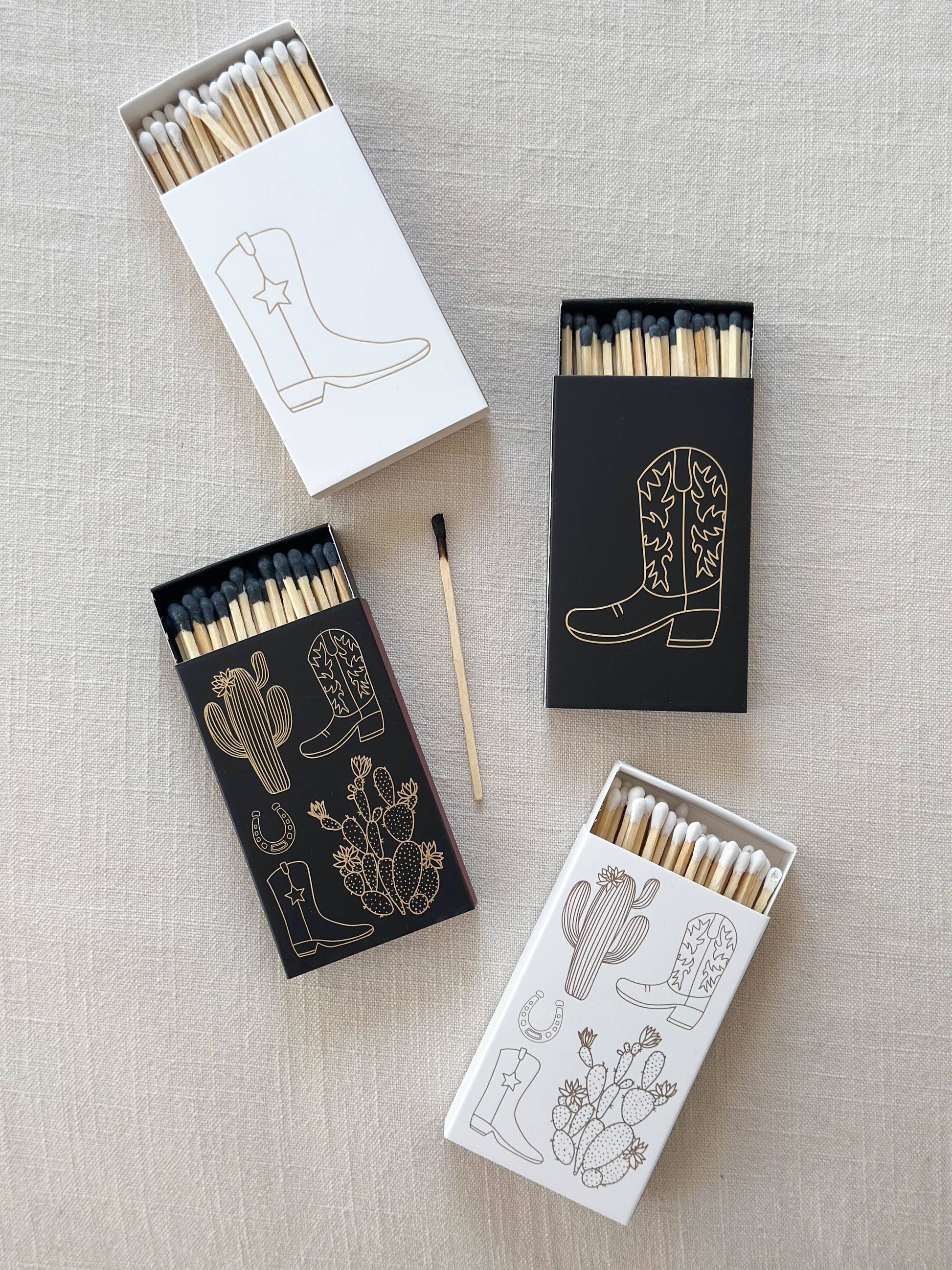 This playful Southwest design features hand drawn cowboy boots and cactuses printed on a black box with gold foil.