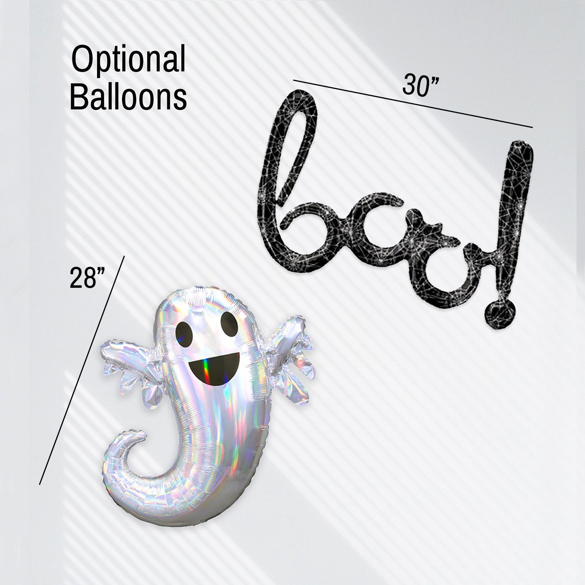 • Balloons in black, orange, black-and-white marble, and ghost + bat print