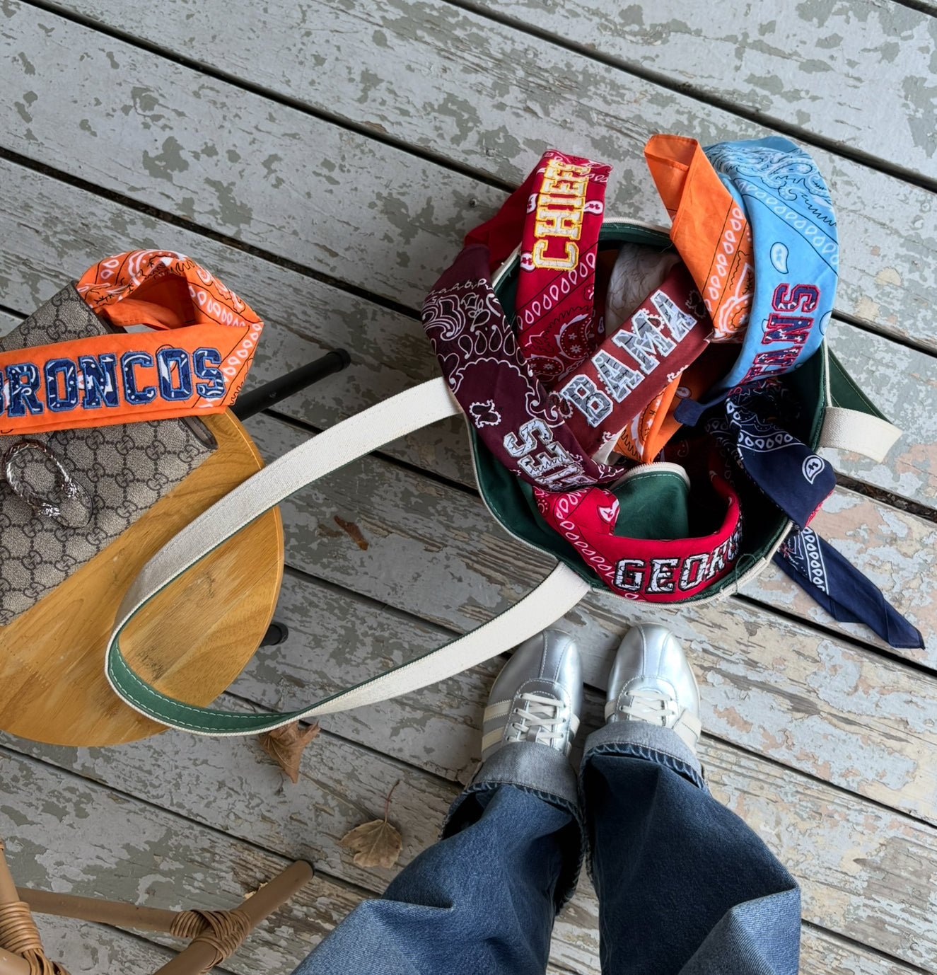 Our football fan bandanas are 100% cotton bandana appliqué on 22 x 22 bandanas. They are designed to be worn in a variety of ways including as a neck tie, bag strap, headband, etc. They are even perfect for pups!