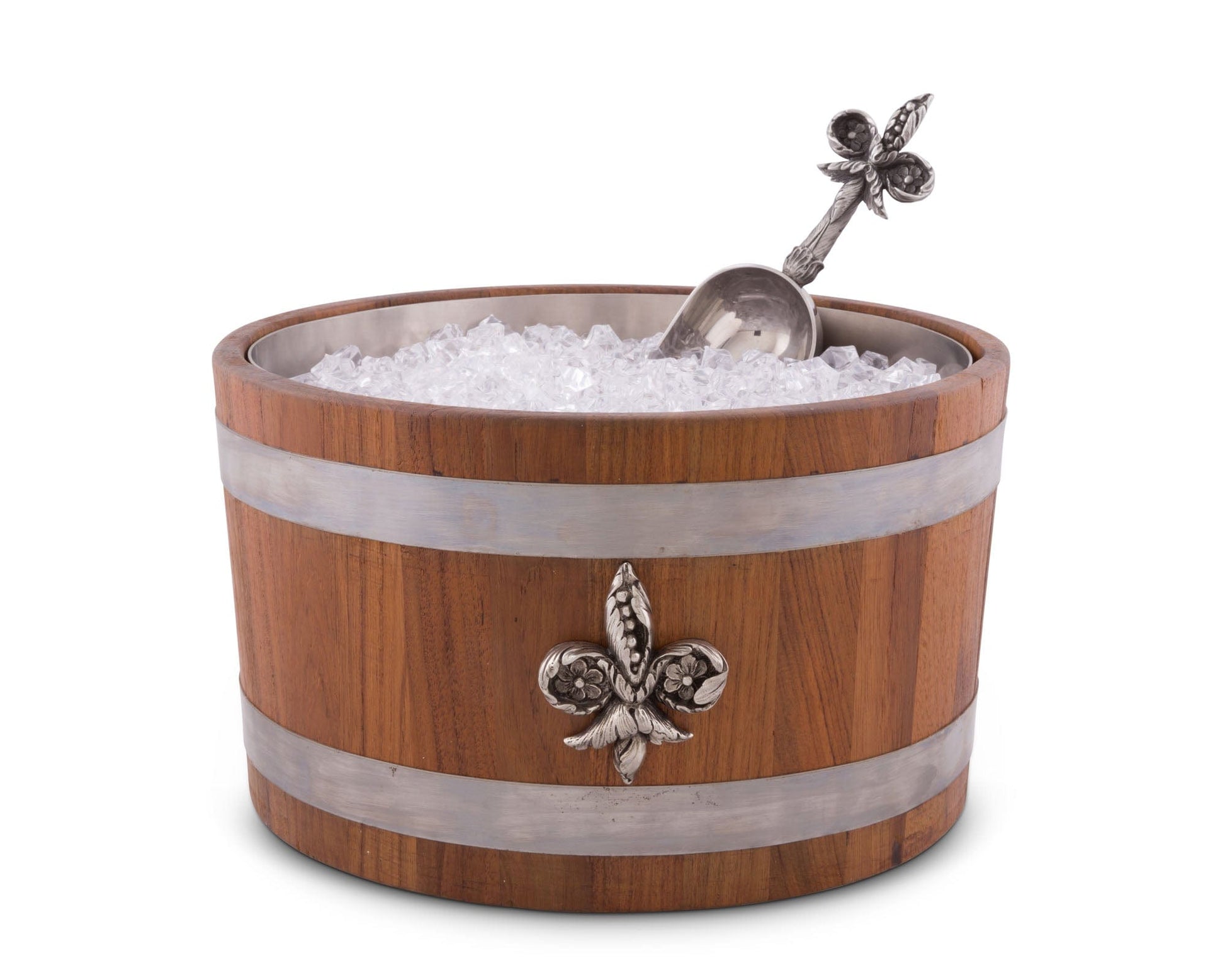 Make your garden parties grand with our Fleur de lies Teak Beer Cooler. This unique beer cooler is an essential outdoor entertaining accessory for those who love luxury and function. Crafted from teak and pewter, it stands for elegance and durability. The teak container is generously sized to accommodate your beverages at 6.75" T x 11" W inches, making it a perfect companion for gatherings. The removable stainless-steel liner ensures easy cleaning, while the Fleur de Lis emblem adds a touch of striking sophistication.