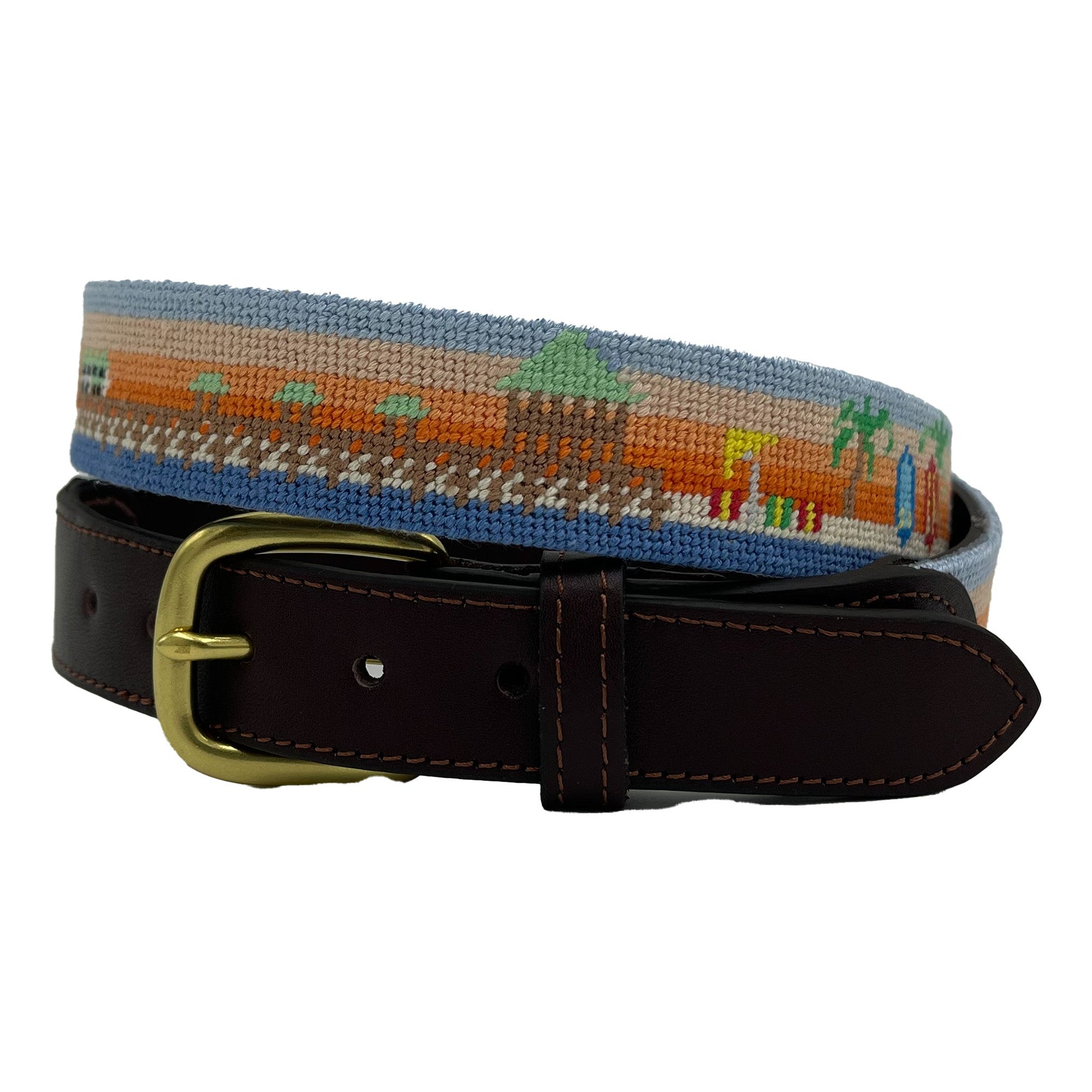Example: size 34 pants waist will generally fit best in a size 38 needlepoint belt. Due to the construction of the belt, it will be a bit stiffer at first and the leather will soften with wearing.
