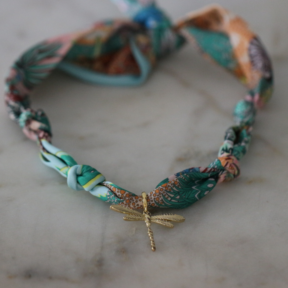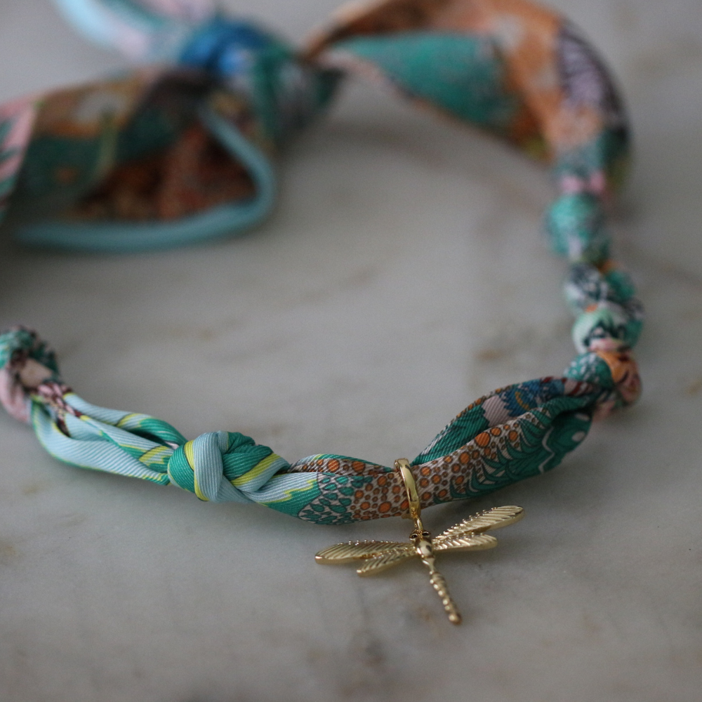 Bring a touch of nature’s beauty to your style with the Golden Dawn Dragonfly Scarf Necklace. Featuring a delicately detailed golden dragonfly charm suspended from a soft, patterned scarf necklace, this piece blends whimsical charm with effortless sophistication.