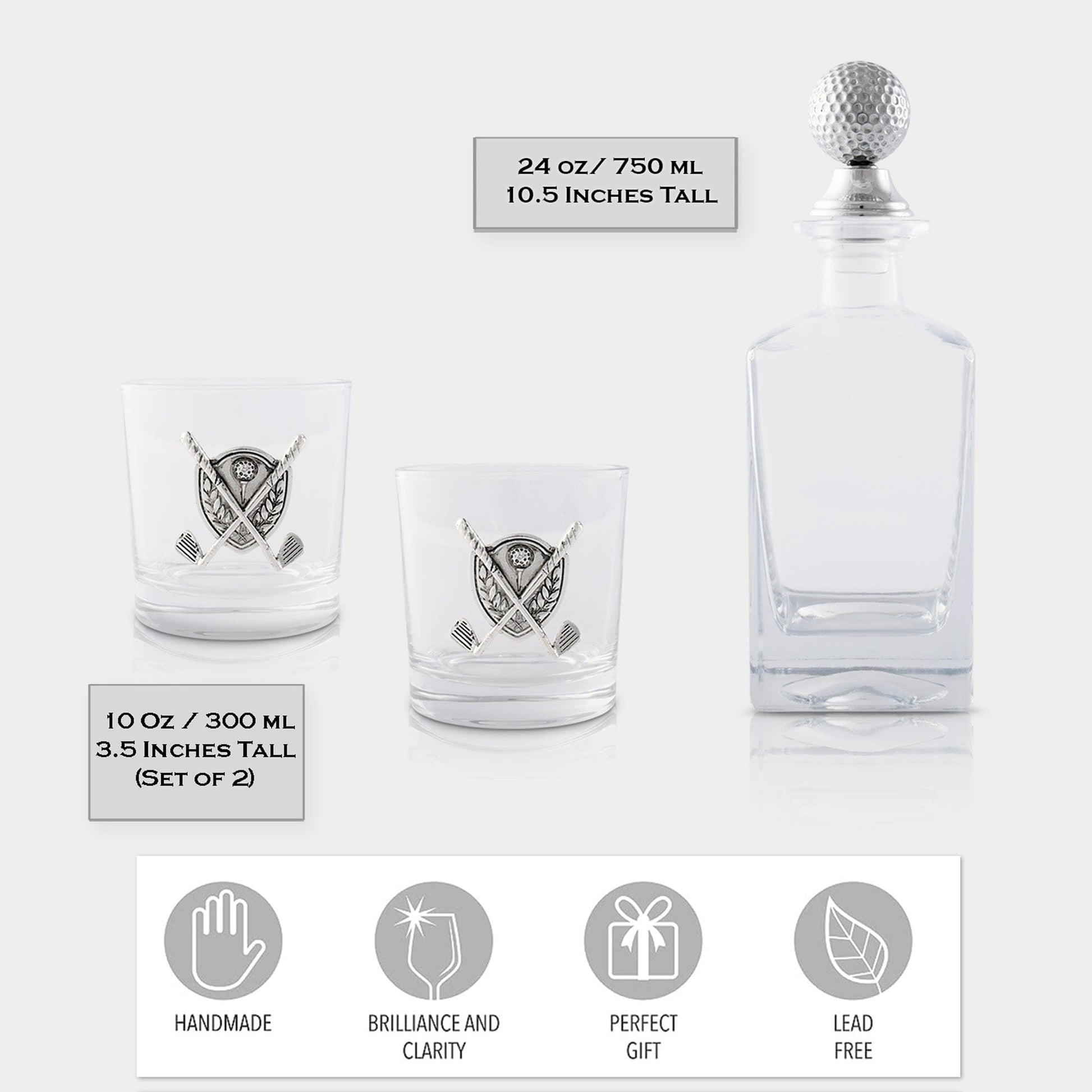Give your home bar a sporty touch with the uniquely designed Golf Decanter Set with Pair of Glasses. Crafted from premium Aluminium and Glass, this set features a generously sized, 24 oz decanter with a 3D golf ball stopper and two 10 oz glasses, each adorned with a metal golf ball accent. Ideal for special occasions like hosting a golf tournament party. Or, enjoy a quiet evening at home with this artful golf-themed bar set.