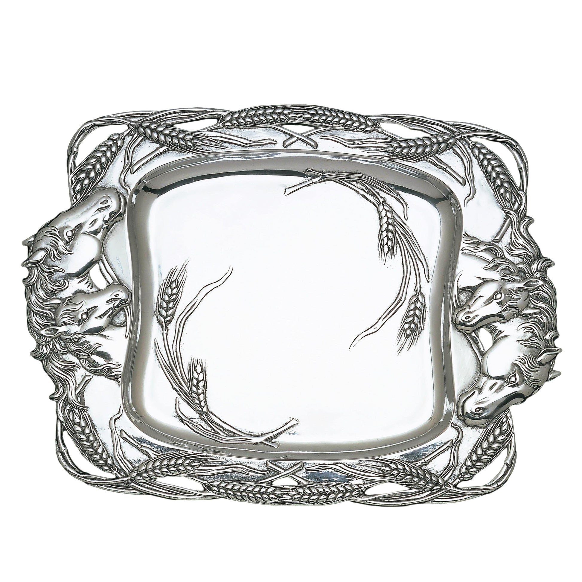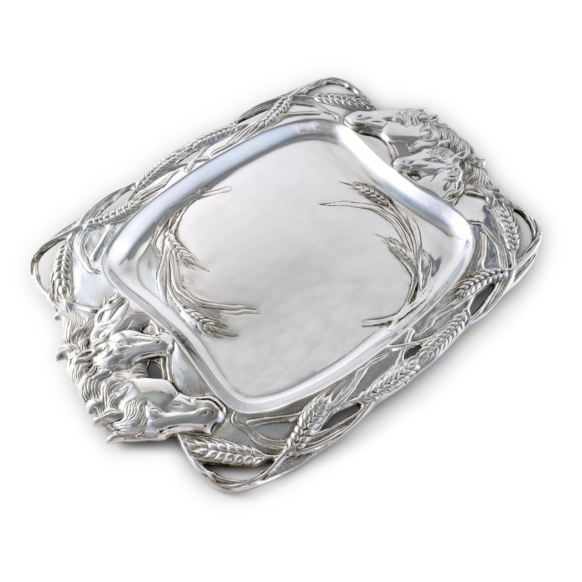 Experience the rustic charm of our finely detailed Arthur Court's Equestrian Horse Clutch Tray. Ideal for serving at your elaborate rustic themed parties, this exquisite piece from Arthur Court's Equestrian Collection adds a Renaissance touch to your special occasions. Reflecting superior craftsmanship, this handcrafted aluminum horse clutch tray presents a delightful gifting opportunity.