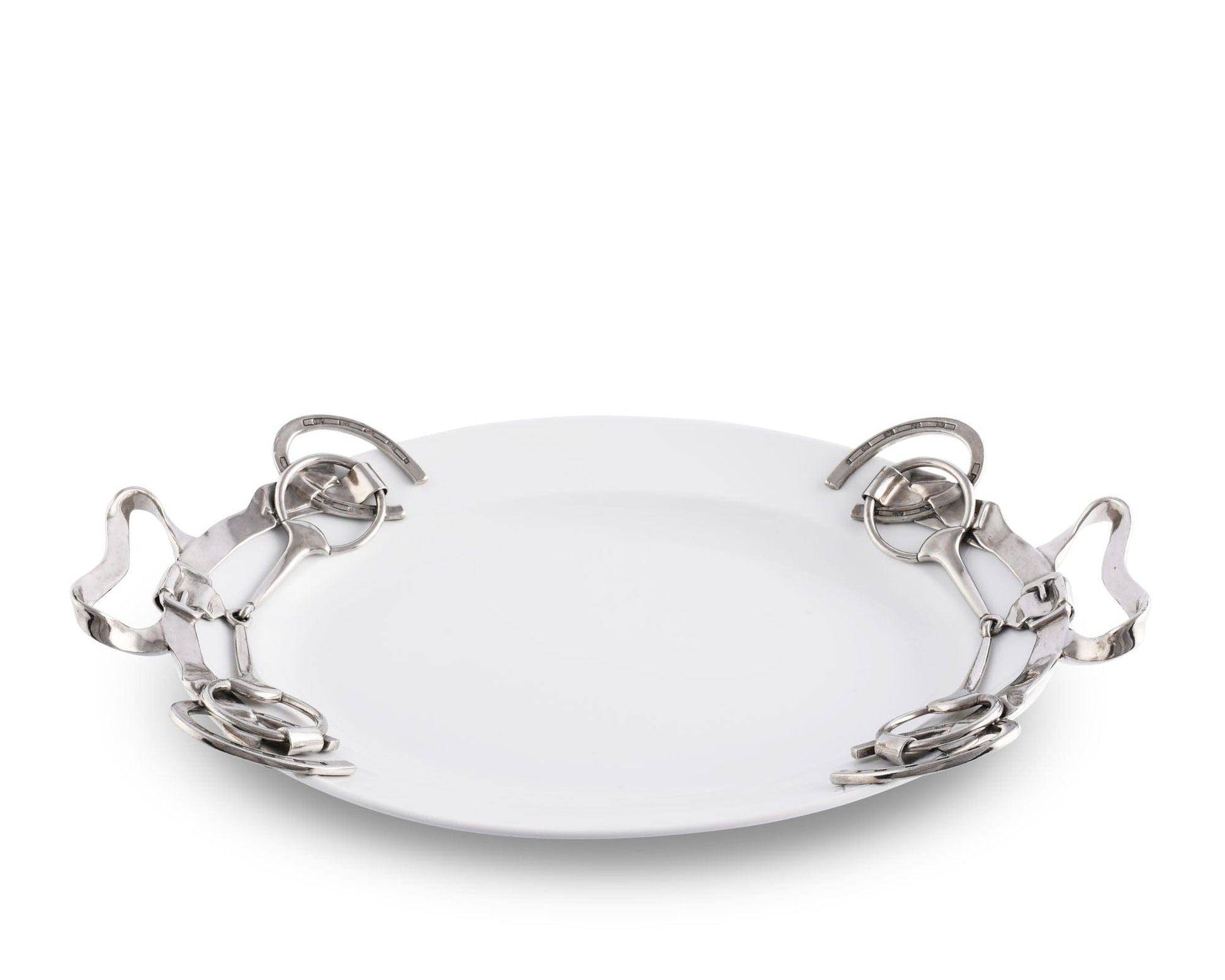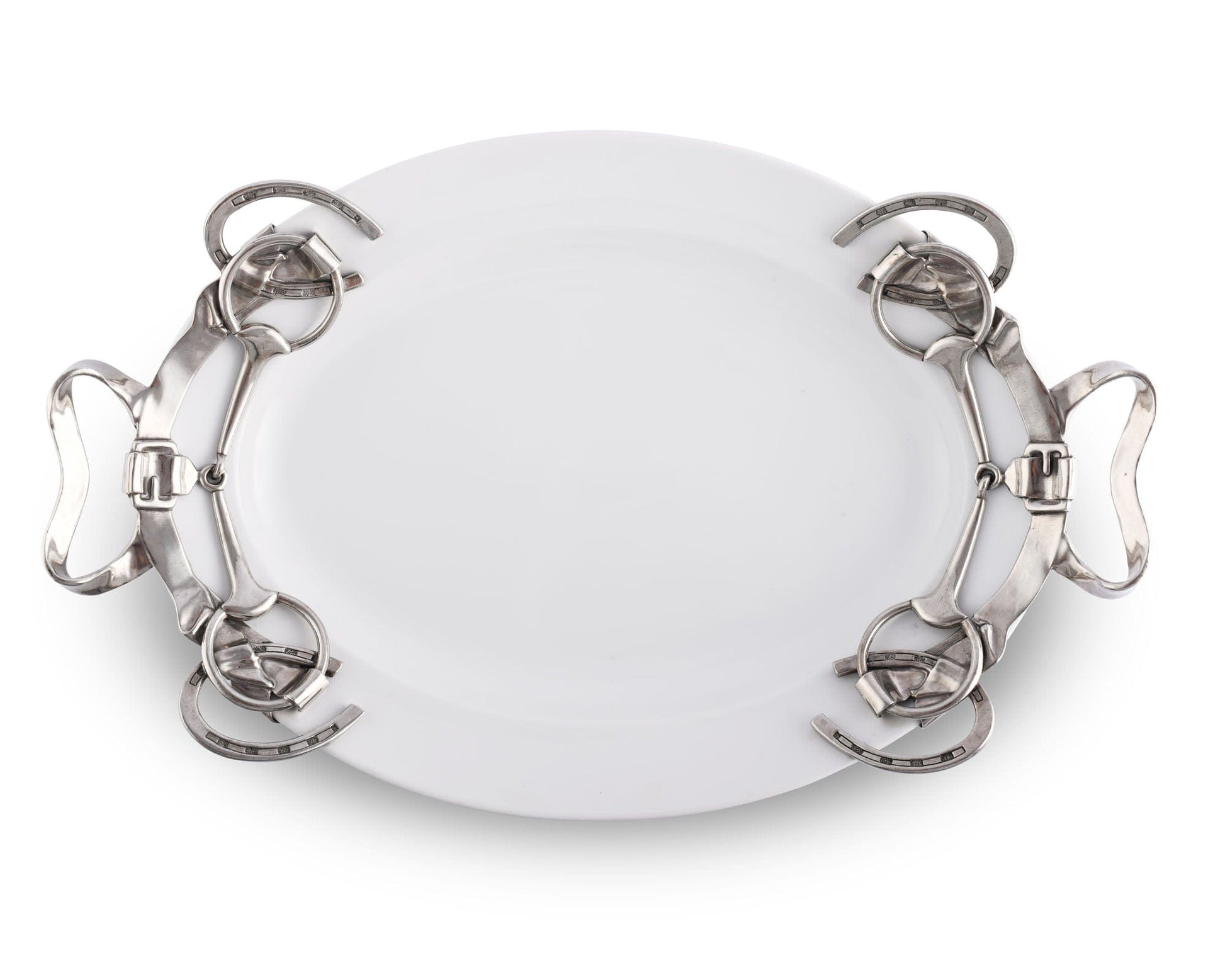 Meticulously crafted from luxury-grade pewter and stoneware, this Large Horseshoe and Bit Tray from Vagabond House is an innovative and elegant addition to any event. With stunningly realistic snaffle bits, horseshoes, and cinches as handles, it's the perfect accent for any horse-lovers' gathering. The generous size of this tray at 22" L x 14" W x 2" H inches, provides ample space to display your culinary creations with style.