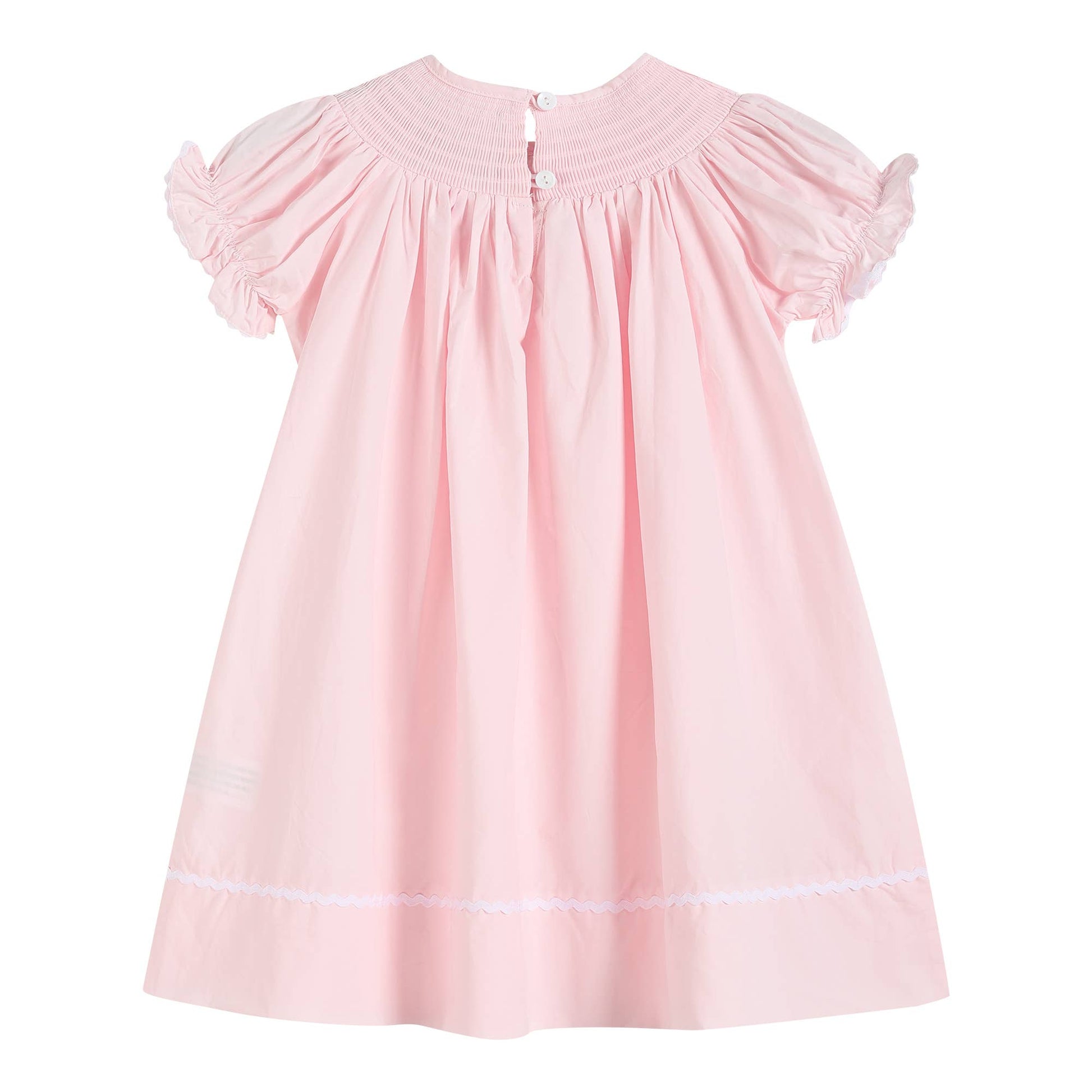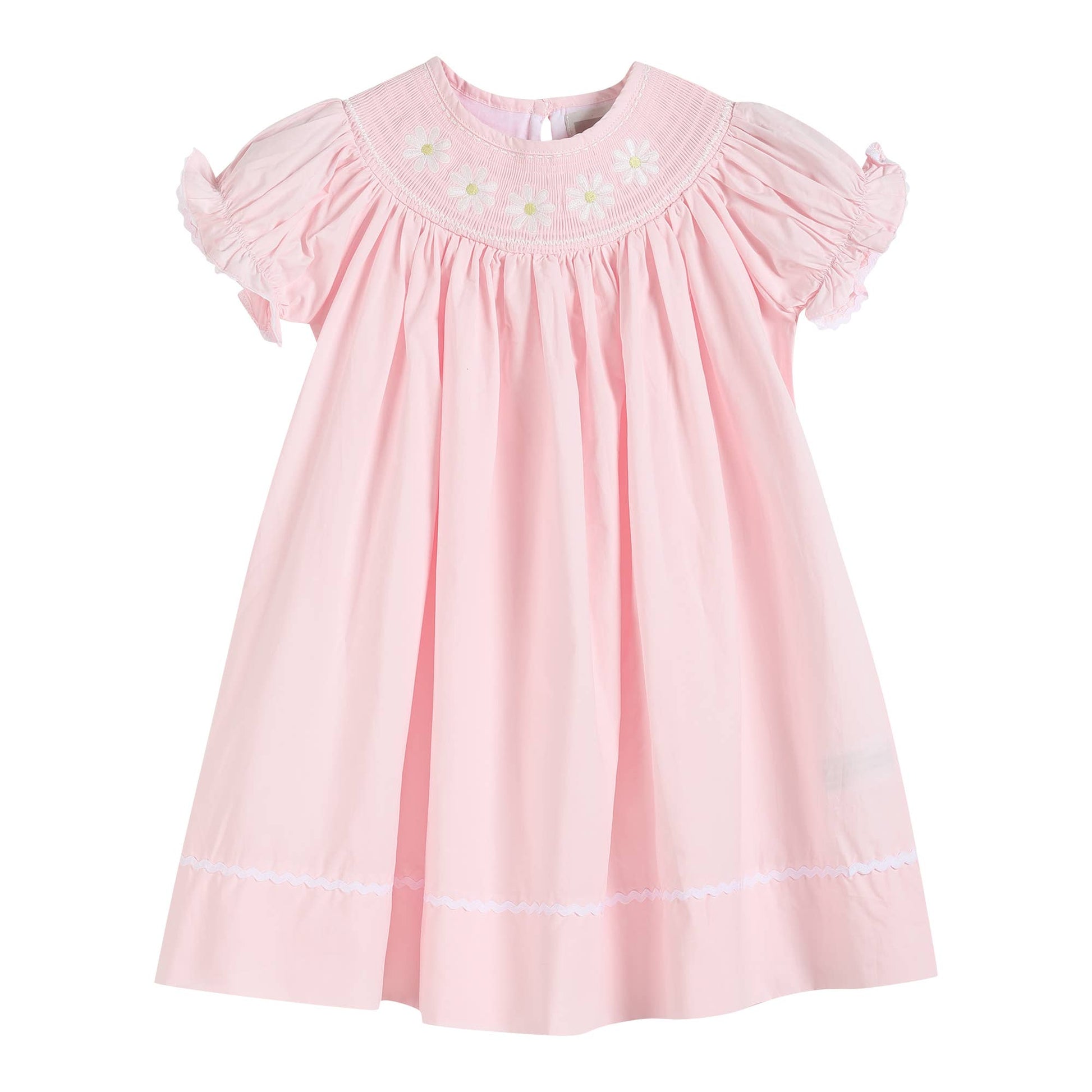 Precious in pink! This beautiful light pink bishop dress features a smocked neckline and gorgeous embroidered daisies. Pluck your little one out of the crowd and into the spotlight with this flowery stunner!