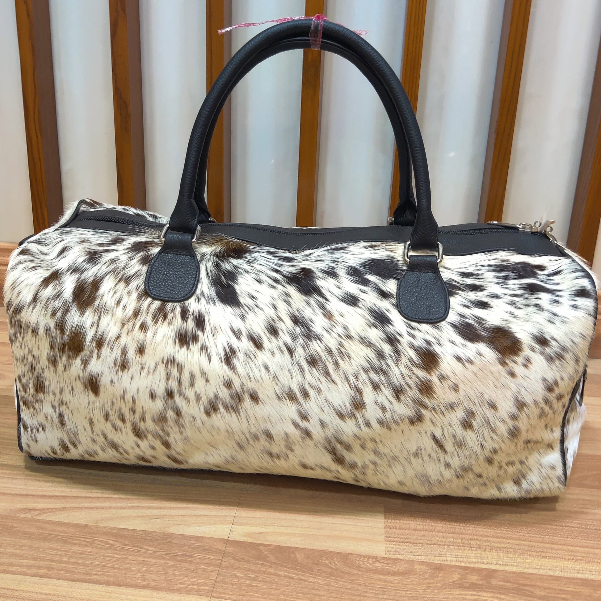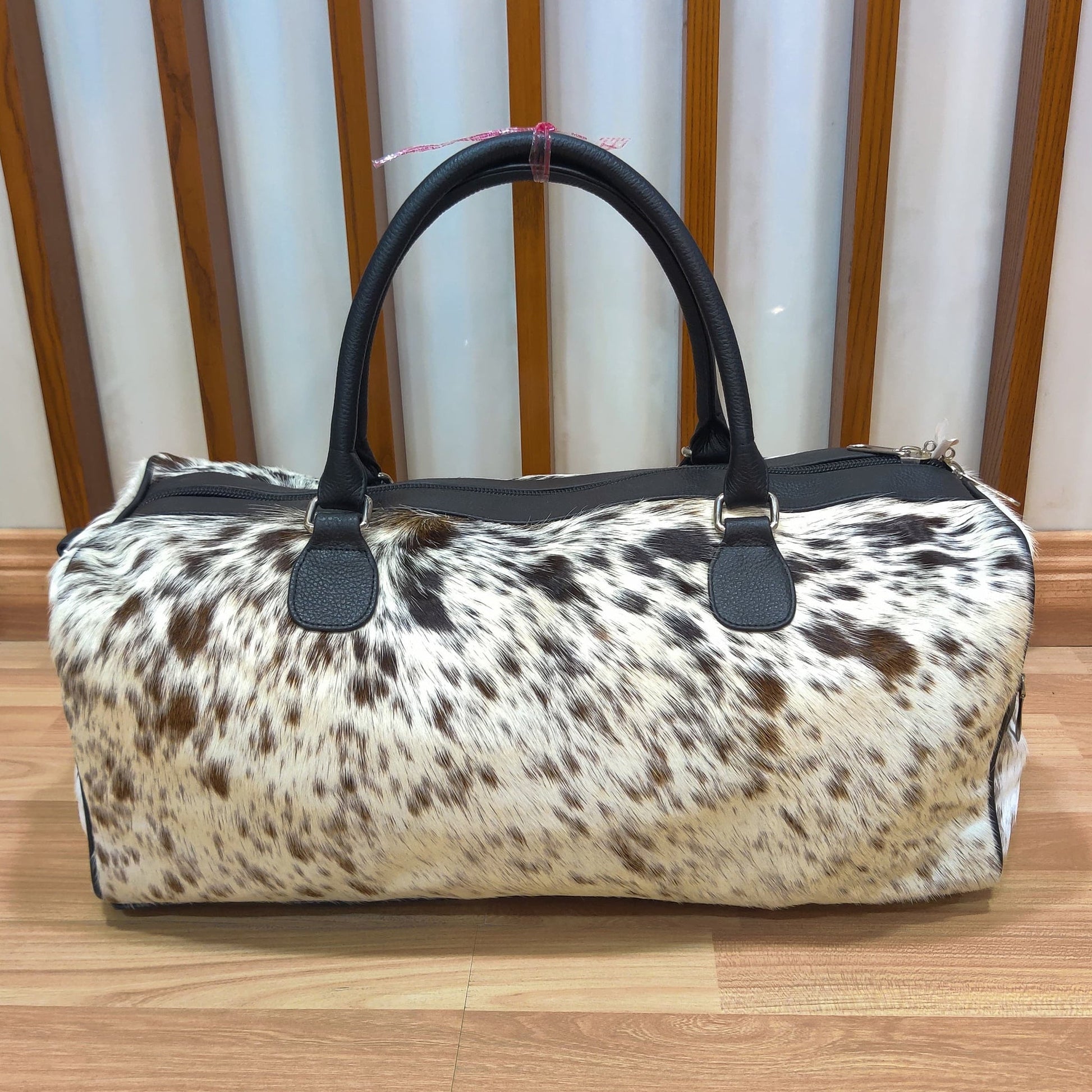 Introducing our stunning cowhide duffel bag - the perfect fusion of rustic charm and modern sophistication. This unique hair-on animal print bag is not only a stylish piece of luggage but also a testament to exceptional craftsmanship and attention to detail. Measuring 20x12x11 inches, it's the ideal size for a weekend getaway or a chic carry-on for your next flight. The eye-catching design ensures that you'll be turning heads wherever your travels take you.