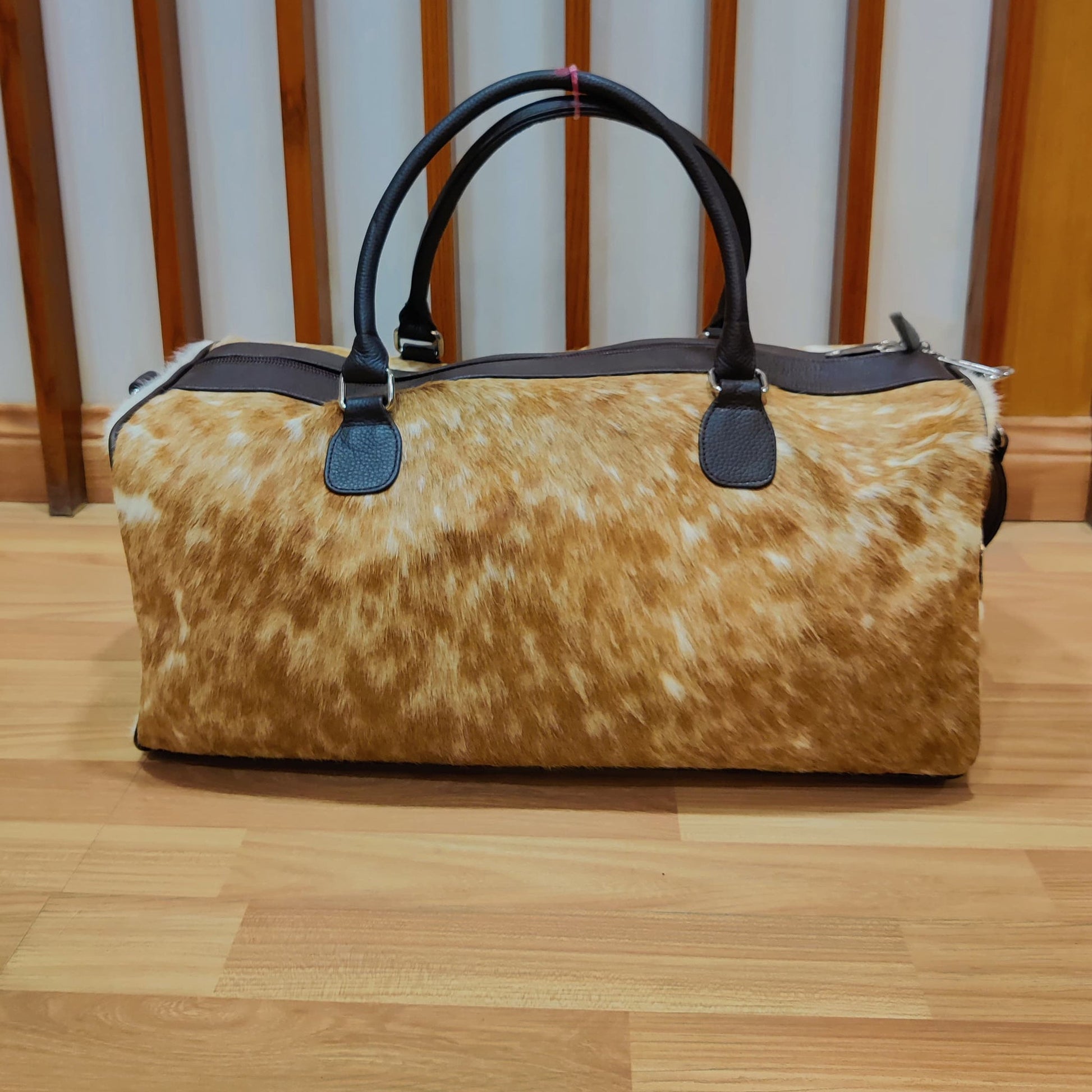 Introducing our stunning Medium Cowhide Duffel Bag, the perfect combination of rustic leather and unique animal print design. This hair on bag is not only a stylish weekend travel bag, but also a thoughtful gift for him, making it an ideal choice for anniversaries or birthdays. With its generous size of 20x12x11 inches, this cowhide duffel bag offers ample space for all your essentials while showcasing your appreciation for one-of-a-kind, handcrafted items.