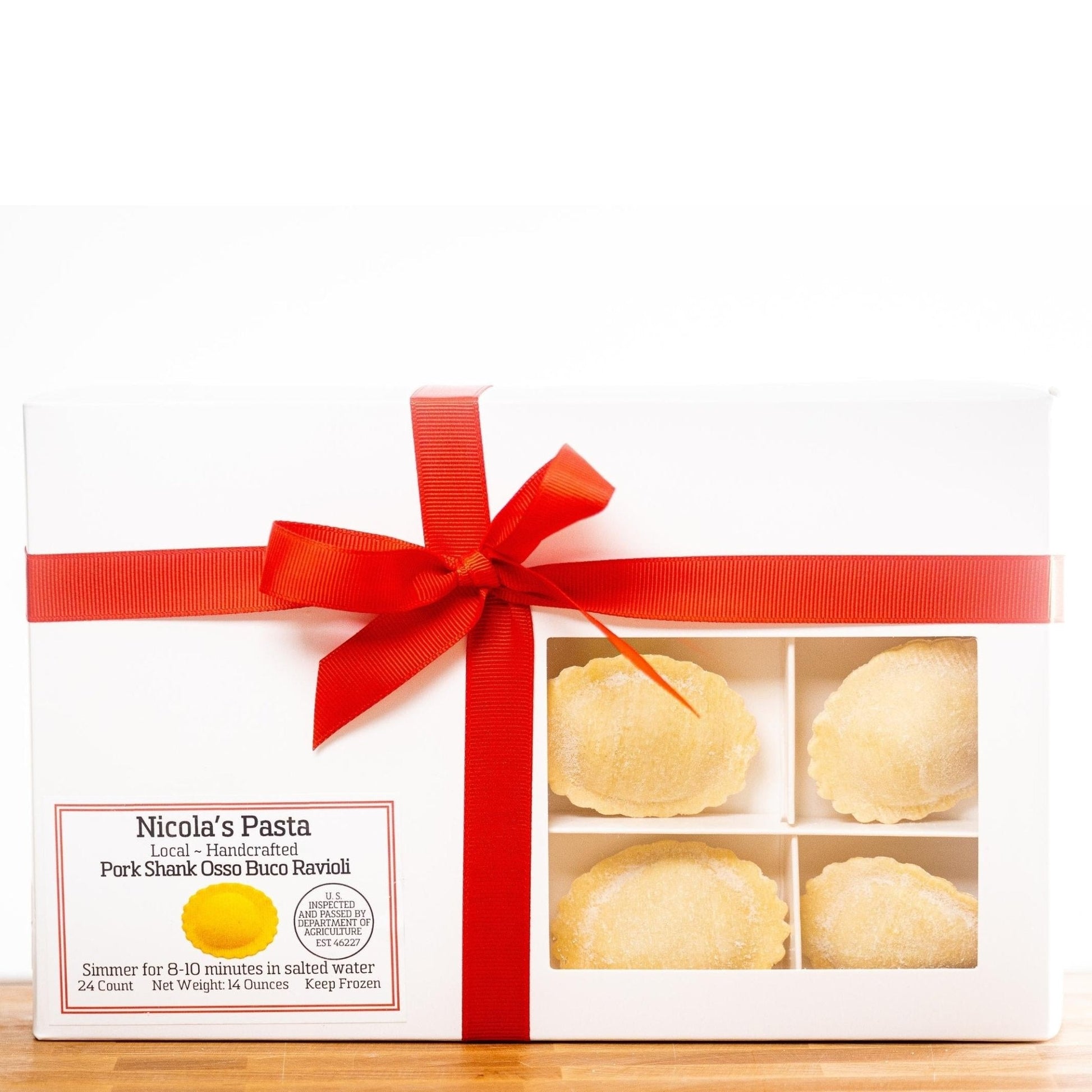 ##0##A wonderful meal of ravioli starts with premium and authentic ingredients. And what could be better than our Pork Osso Buco Ravioli? It’s fresh. It has the signature Italian taste. It is prepared from simple and natural ingredients — Organic unbleached semolina flour imported from Italy, local heritage breed pork shanks braised overnight in apple cider, and Parmigiano Reggiano. And, it tastes wonderful! Our gourmet and artisanal Pork Osso Buco Ravioli has everything to make it a dish de la crème. We make it fresh to order and flash freeze it to preserve the freshness of the goodness of organic ingredients that are sourced from local farms. Can we skip to the good part? It contains no preservatives. It works well for a quick dinner or gift someone who loves pork shanks.