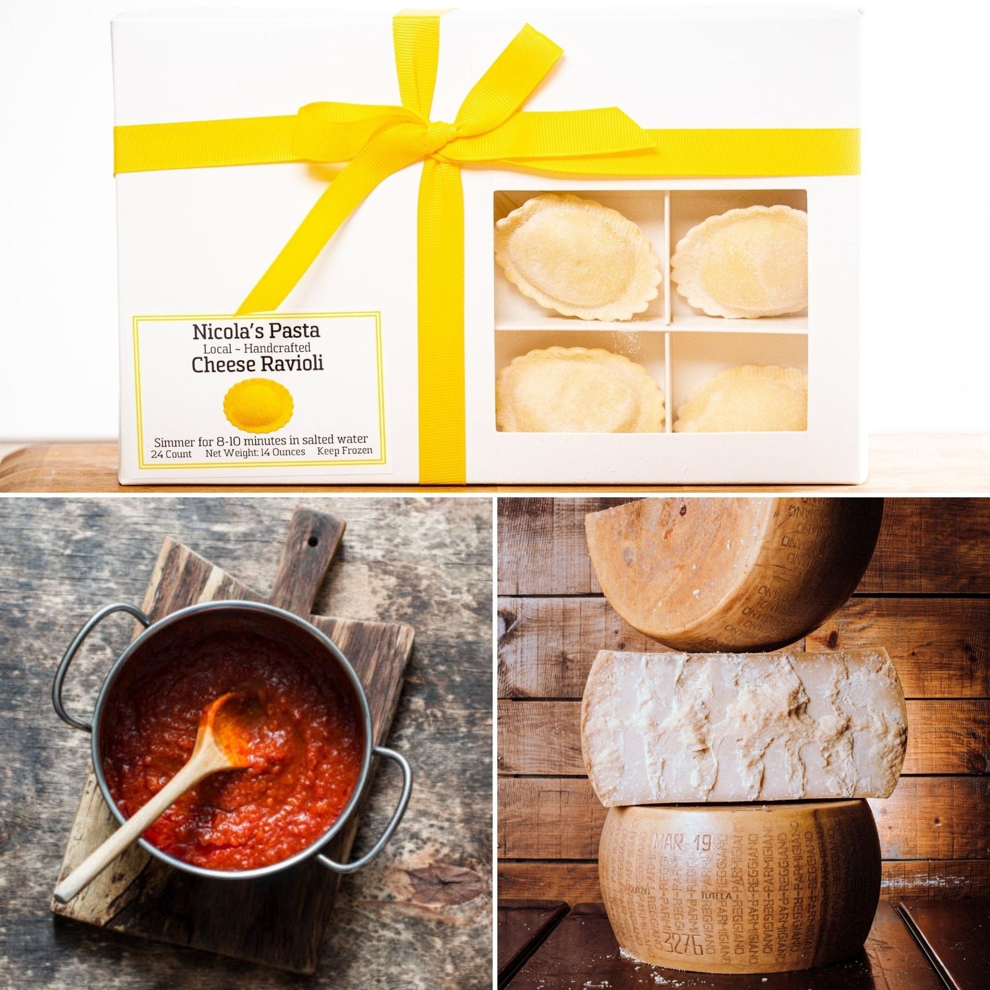 Quantity: 2 boxes of ravioli, 2 pints of tomato sauce, 1 Piece of DOP Parmigiano Reggiano