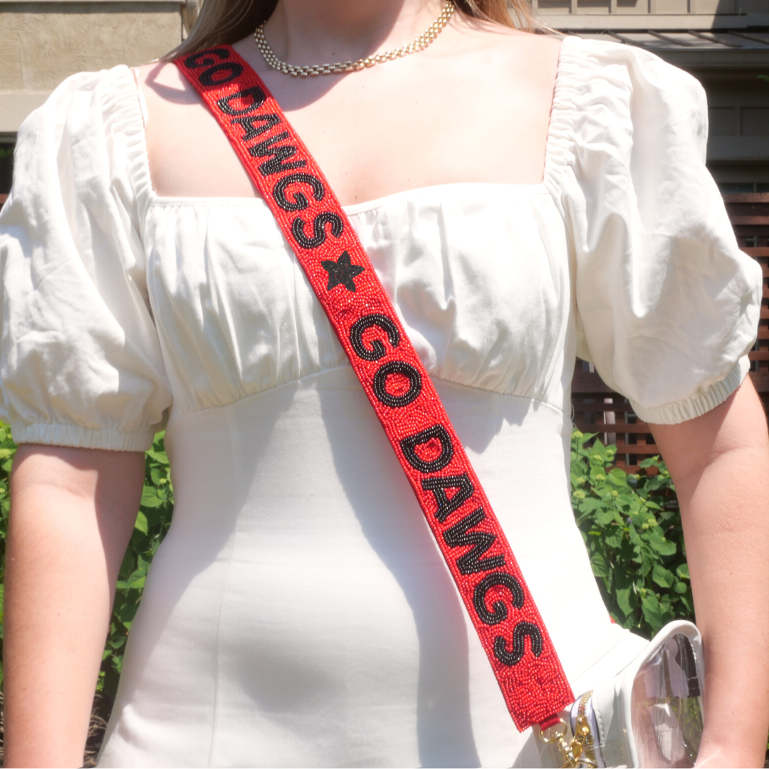 Introducing our handmade beaded purse strap, perfect for showing off your love for the University of Georgia and their iconic rallying cry, "Go Dawgs!" Perfect with a clear bag for game day.