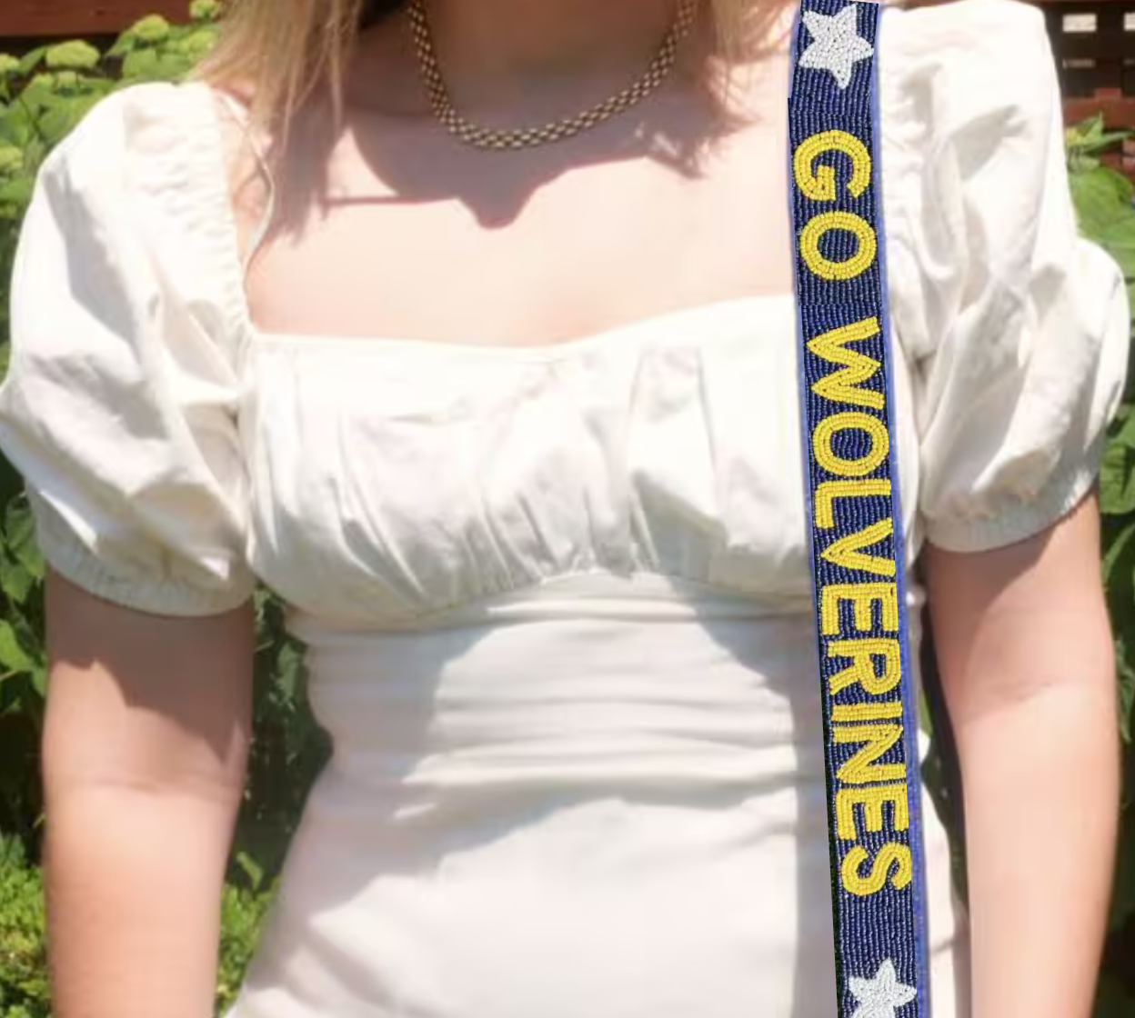 Introducing our handmade beaded purse strap, perfect for showing off your love for the University of Michigan and their iconic rallying cry, "Go Wolverines!" Perfect with a clear bag for game day and GO BLUE!