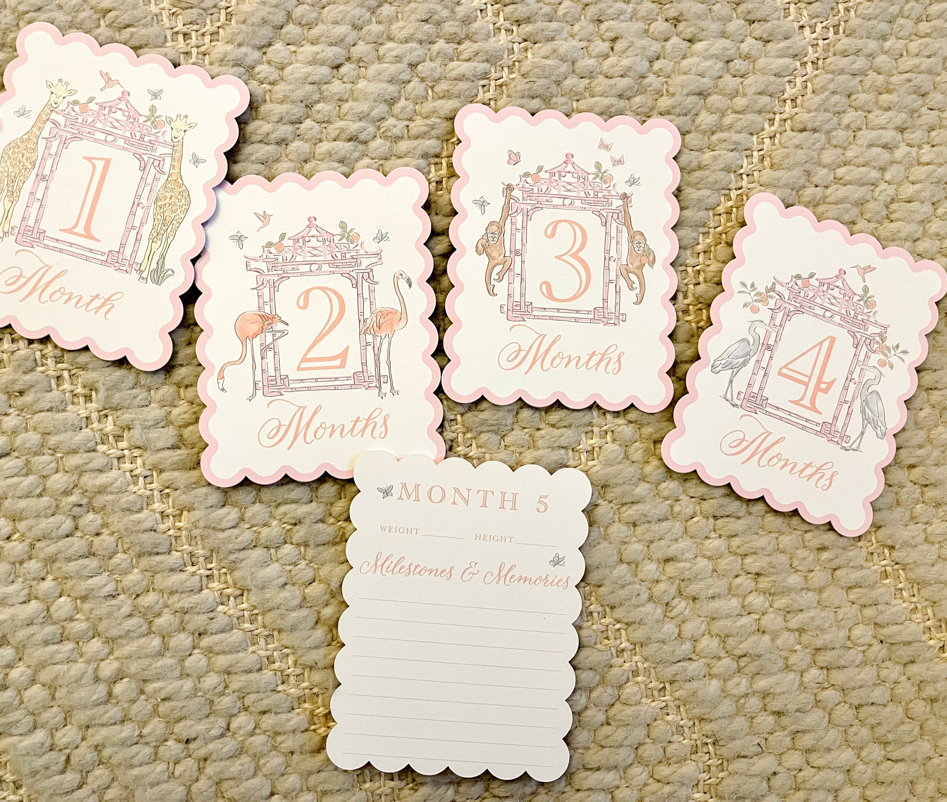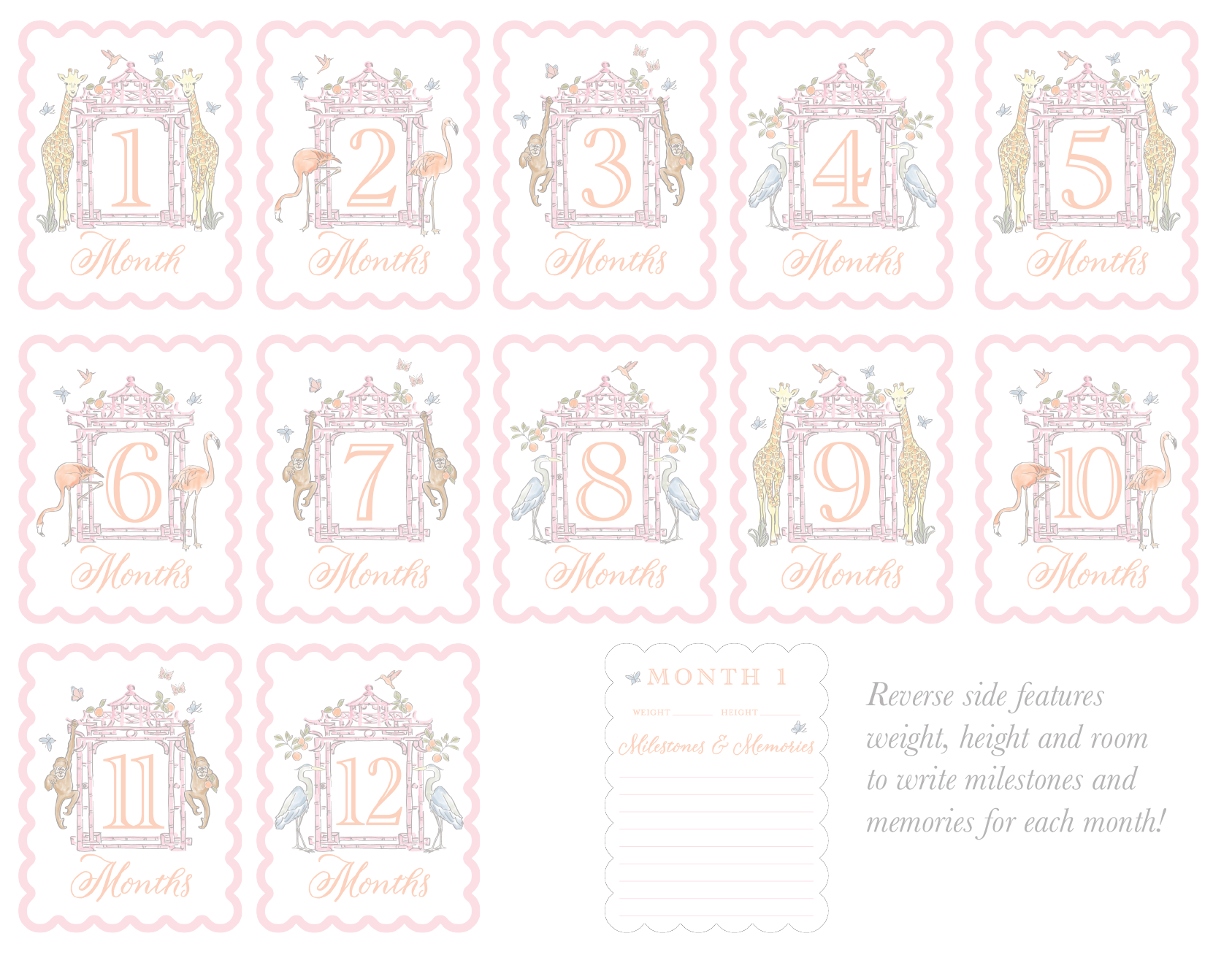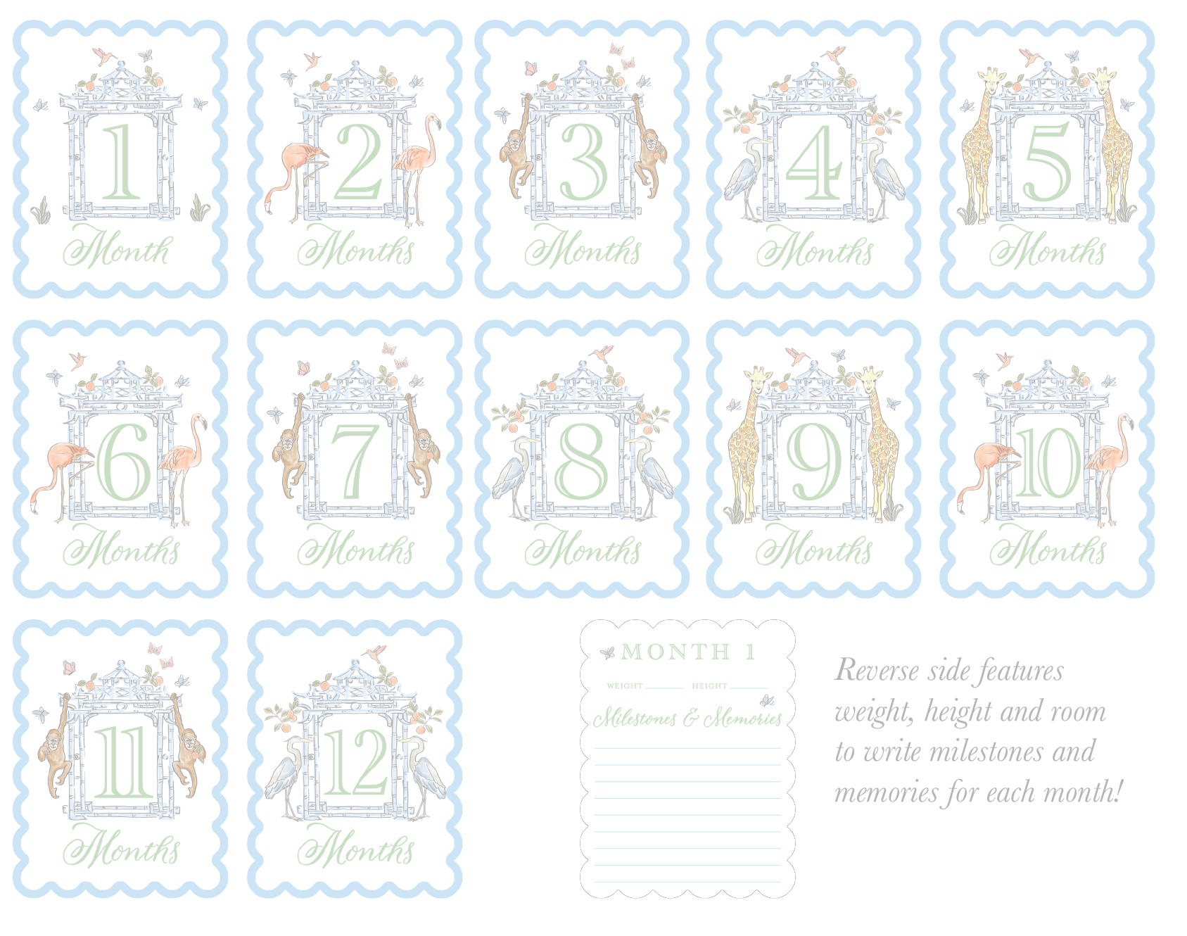 Capture baby's first year month by month with these precious scallop shape milestone cards. Includes a twelve cards (one for each month), with room on the back to jot down baby's stats, milestones and memories! Size 4.25 x 5.5. Available in blue and pink.