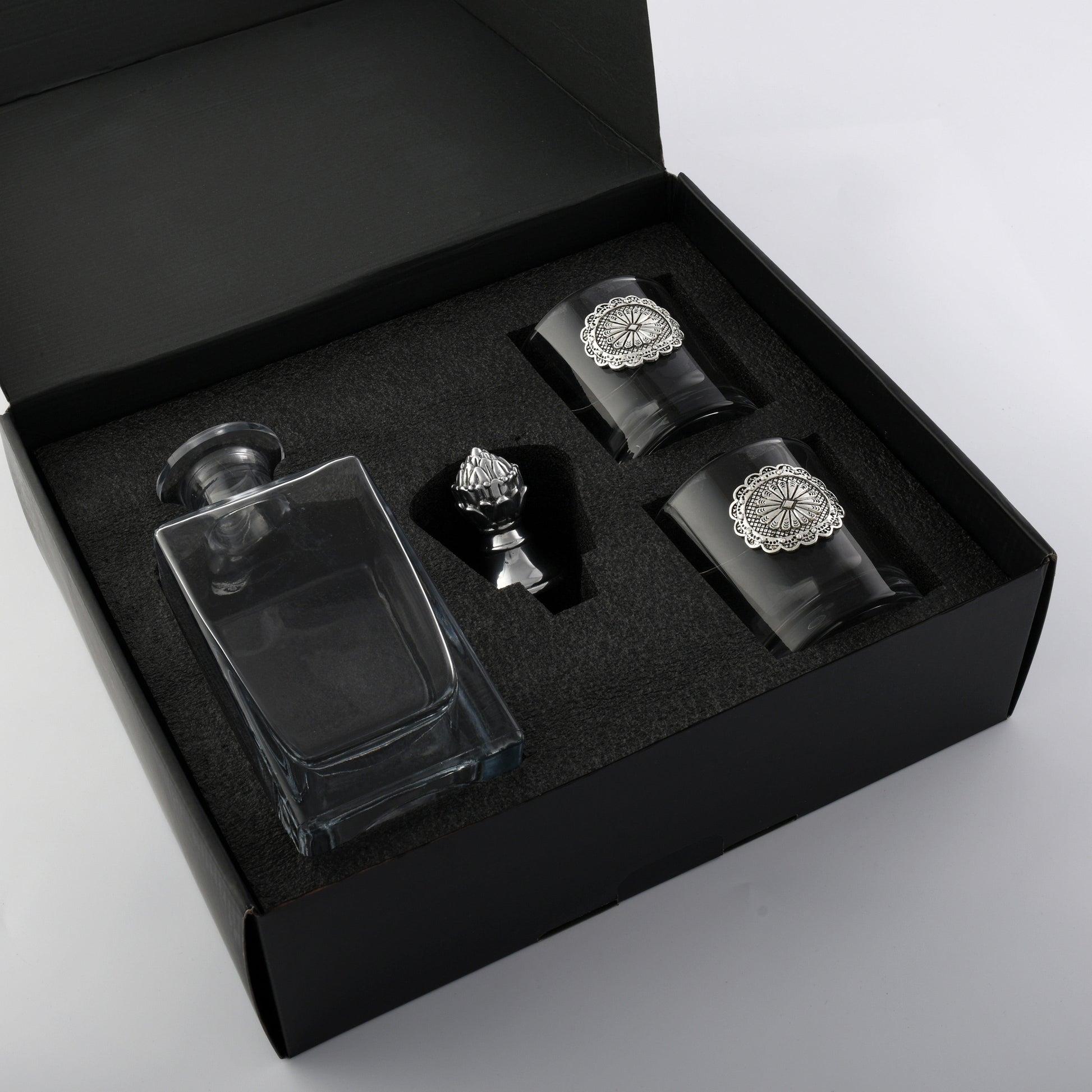 The Arthur Court's Decanter Set offers a striking balance between sophistication and versatility. Crafted with precision, this stylishly-designed set embellished with western concho detail adds an elegant touch to any setting. This is more than just a simple decanter set - it’s a unique blend of style, functionality, and craftsmanship. The set elegantly combines sleek curves and solid design enhancing its appeal, making it a unique bridal shower gift. The Western Concho Decanter Set is a perfect harmony of design versatility and elegance that could only come from Arthur Court.