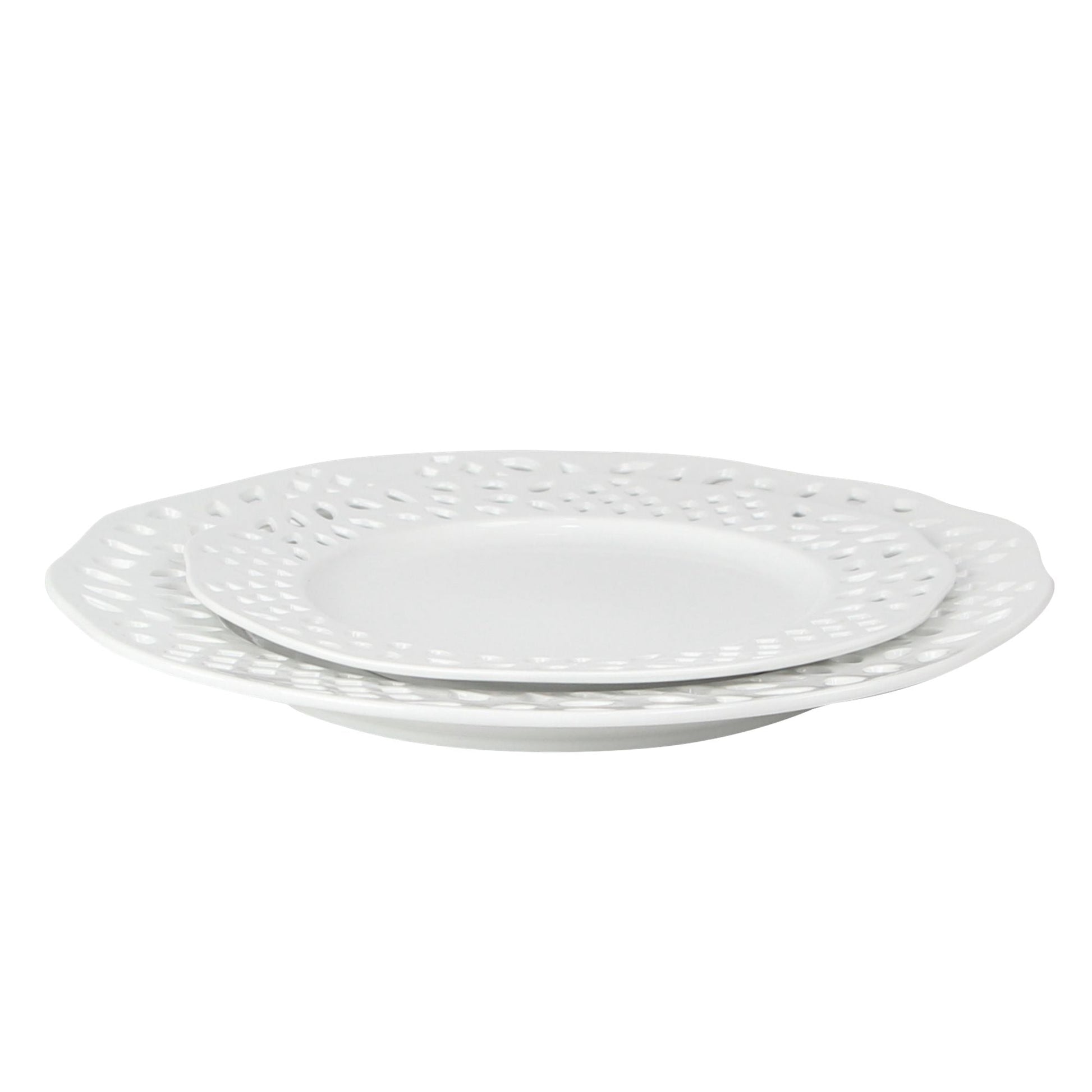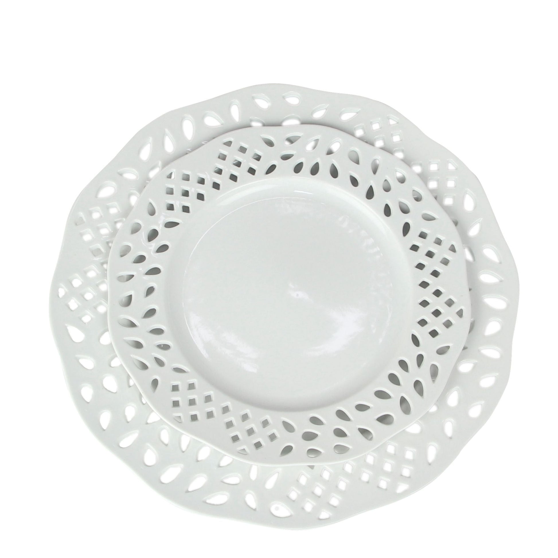 Elevate your dining experience with our Pierced Dinnerware collection. This exquisite set includes a dinner plate, salad plate, and charger, each adorned with intricate raised dot and floral motifs. Crafted to perfection in pure white, these pieces exude elegance and charm, capturing the essence of timeless sophistication. Whether used individually or as a complete set, they effortlessly enhance any table setting with their delicate detailing and versatile appeal.